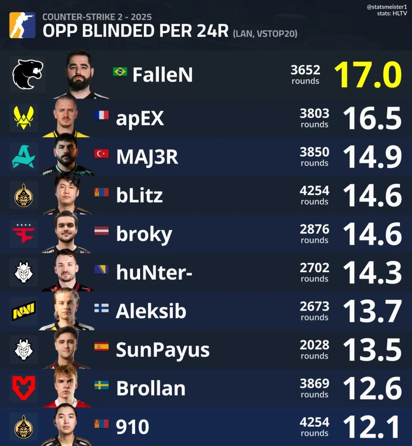 • Статистика: В среднем FalleN ослеплял 17 противников за каждые 24 раунда.