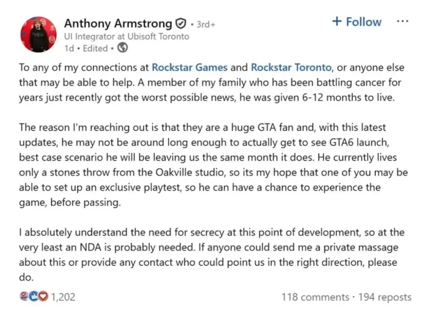 Обложка: скриншот из трейлера Grand Theft Auto VI. Источник: Rockstar Games.Редкий случай человечности со стороны Rockstar Games растрогал игровое сообщество. Энтони Армстронг, сотрудник Ubisoft Toronto, обратился к коллегам из Rockstar через LinkedIn, рассказав, что один из членов его семьи, большой поклонник Grand Theft Auto, страдает от онкологического заболевания, и врачи отвели ему от шести до двенадцати месяцев жизни. Армстронг попросил дать родственнику возможность поиграть в Grand Theft Auto VI до официального релиза.
