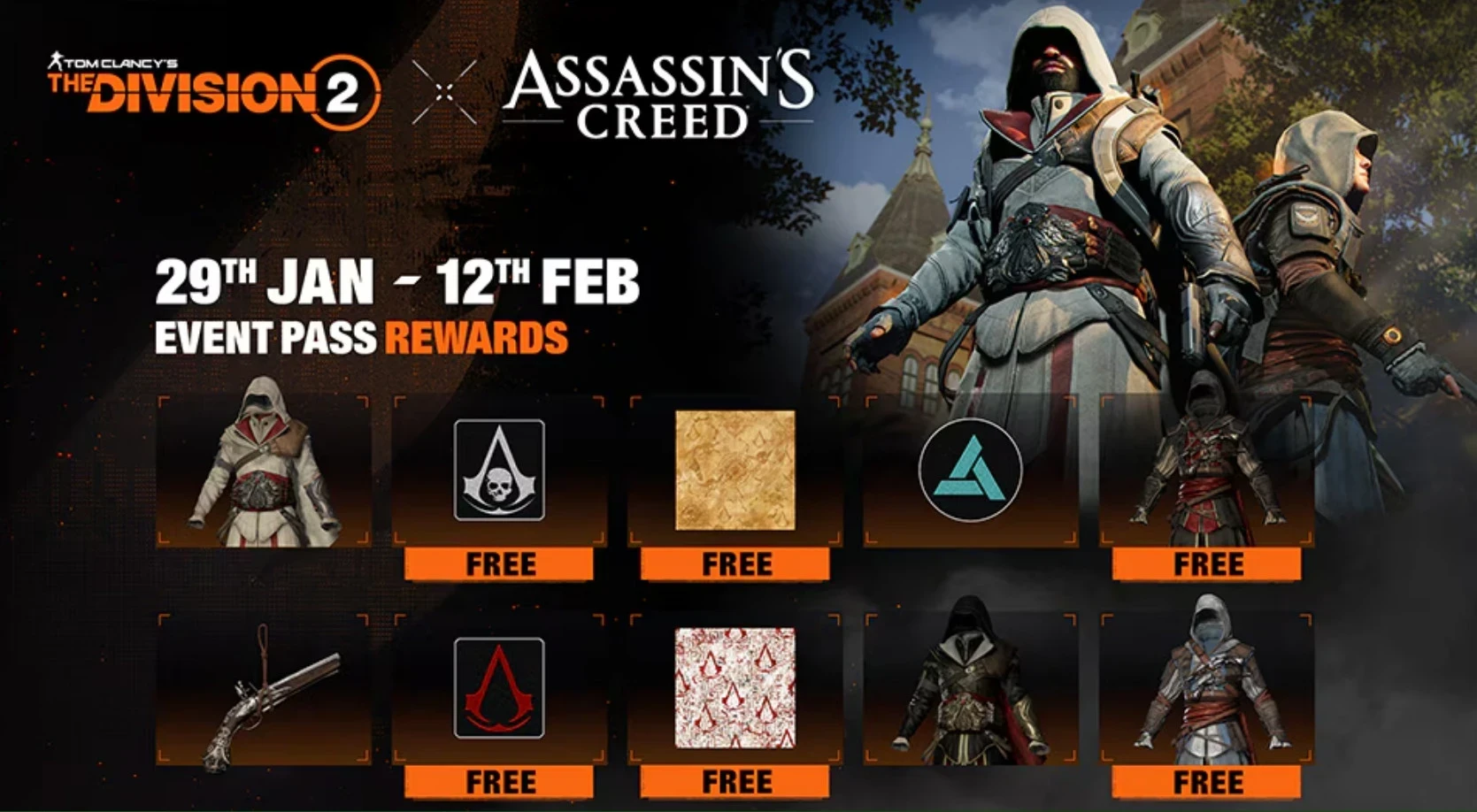 Однако для получения тематических костюмов придётся купить платную версию пропуска. Игроки смогут заработать наряды Эцио Аудиторе, Эдварда Кенуэя и других опасных ассасинов из ранних частей Assassin’s Creed. Пропуск кроссовера прокачивается одновременно с получением сезонного опыта.