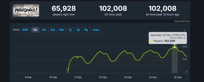 Обложка: скриншот MewgenicsНа выходных тактический рогалик Mewgenics обновил свой рекорд пикового онлайна в Steam — 14 февраля в игре находилось более 102 тысяч человек. Это рекорд для игр Эдмунда Макмиллена, ведь The Binding of Isaac: Rebirth в своё время привлекла только 70 тысяч игроков на пике онлайна.